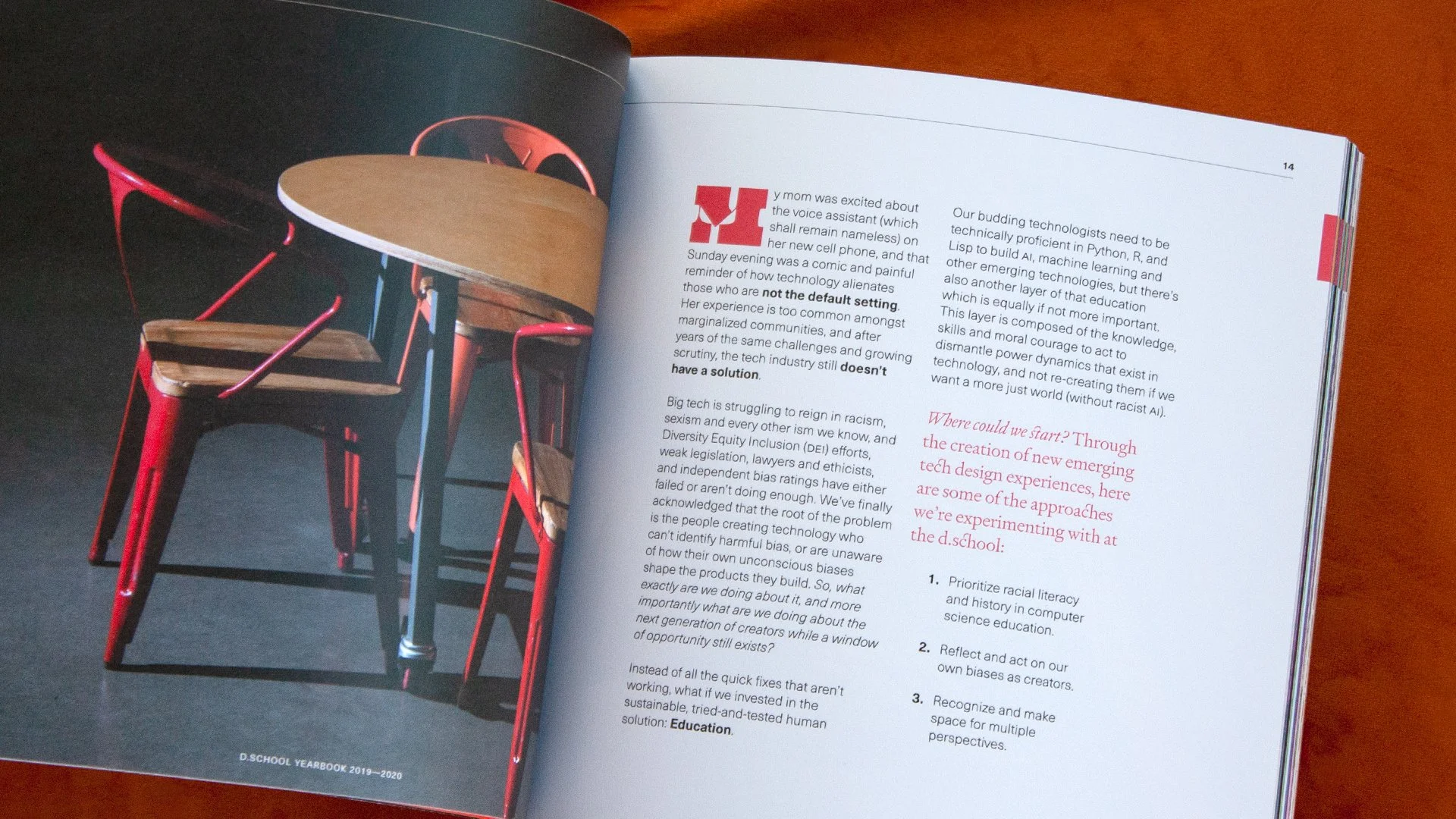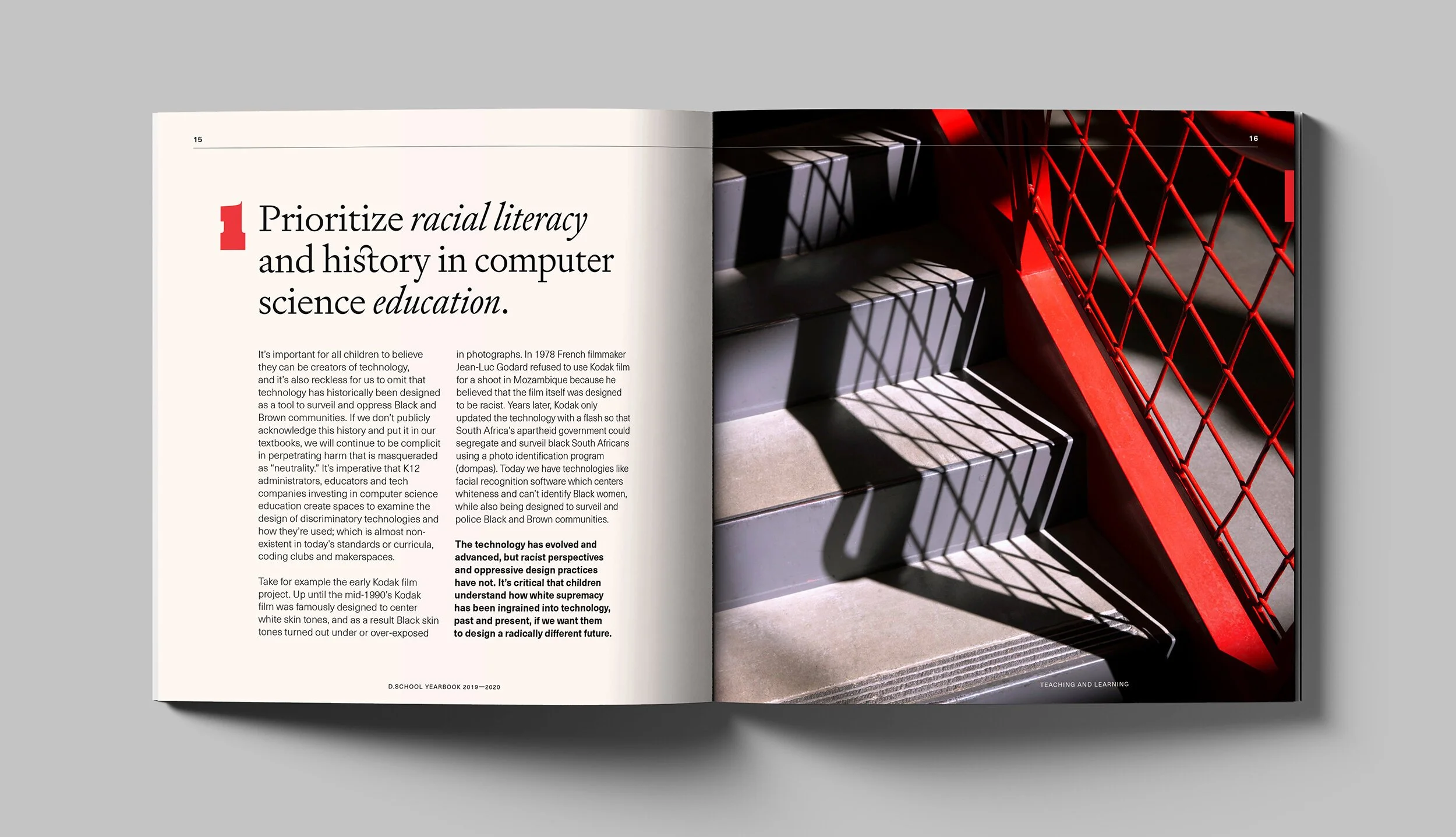 With event and image availability limited during the pandemic, we instead commissioned photographs of empty d.school spaces. Paired with bold typography and a bright palette, the publication captures the team’s innovative methods even through uncertain times.
